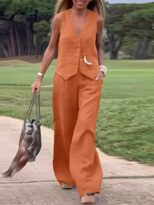 Step into refined sophistication with the Mabel Elegant Two-Piece Set. Designed for both comfort and style, this sleeveless vest and wide-leg pants combo offers a polished yet relaxed look, perfect for warm days and chic outings.